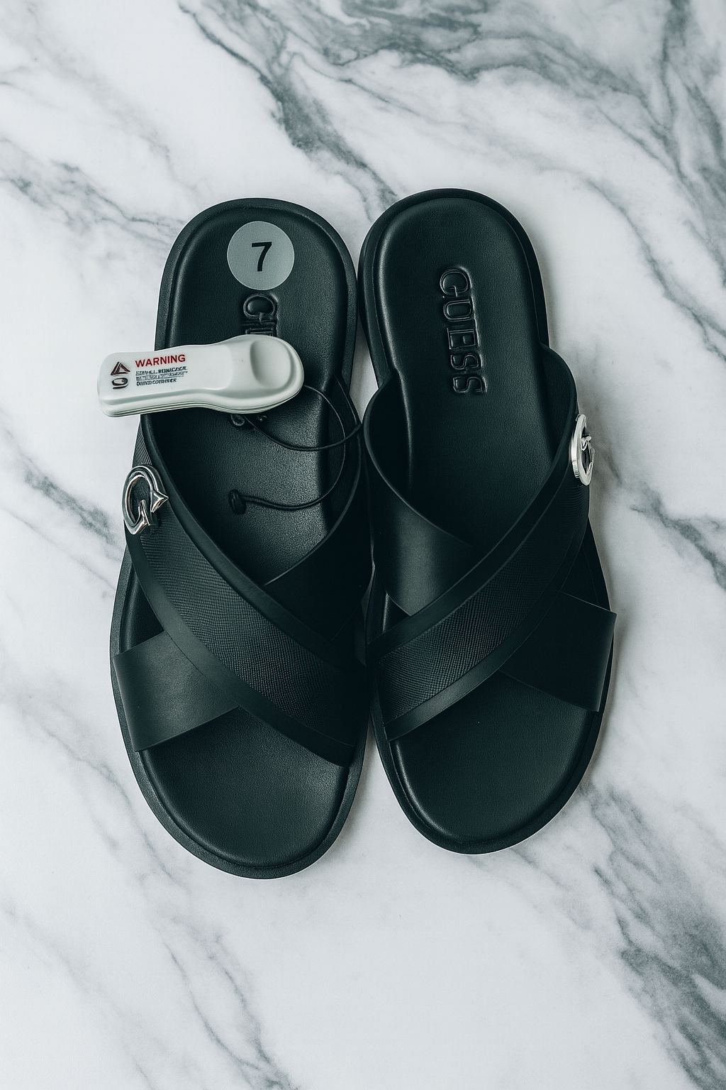 Step up your casual style with these sleek and comfy black slide sandals by GUESS. Designed with durable criss-cross straps, cushioned soles, and a silver buckle accent, these slides are perfect for everyday wear or relaxing days out.